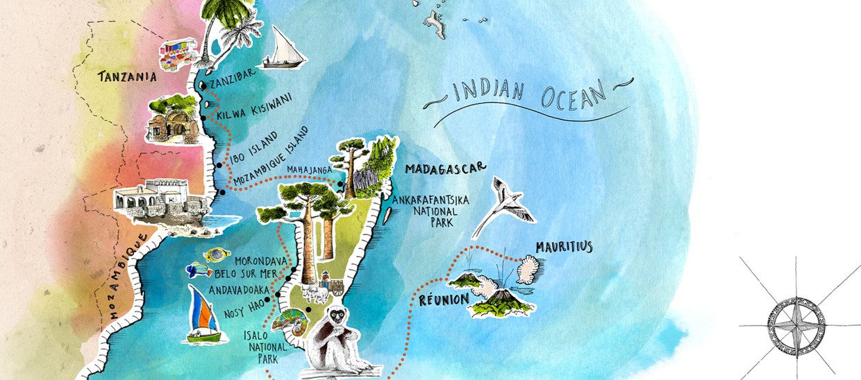 Enchanting Malagasy and Creole culture emanate from colourful street-side markets. Wildlife and wild landscapes rise above sparkling seas inhabited by tropical fish. Lush rainforests hide native lemurs and ancient ruins hold rich history.