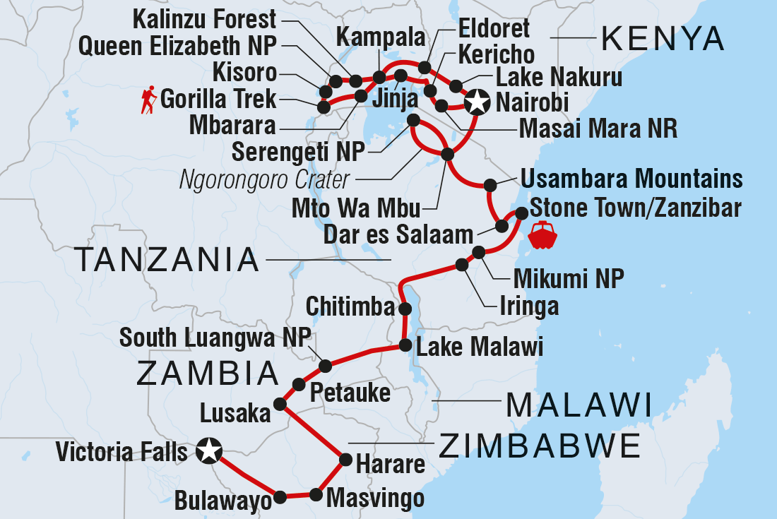 Spend 42 days travelling through the iconic vistas of East Africa. Seek out the rare mountain gorilla in Rwanda’s steamy jungle, enjoy thrill-packed safaris through lush forest and open savanna and finish in Victoria Falls. Be welcomed into small villages in Tanzania and Malawi, relax on sandy beaches in Zanzibar and track the Big Five in the Ngorongoro Crater and Serengeti National Park. This overland adventure is a mix of locally guided excursions and free time to follow your heart to the stuff you want to see.