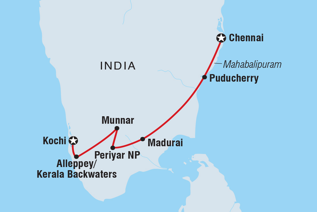 Swaying palm trees, rolling hills and calm backwaters make up southern India’s lush landscape and on this 13-day Premium adventure, you’ll travel off the tourist trail. Head into the home of a local family and be immersed in their culture, head down the French-inspired streets of Puducherry and explore the maze of food stalls in Maduraito. Go into the wilderness of the Periyar National Park to look for local wildlife and tiger tracks, watch a live performance of kalarippayattu and visit tea plantations to learn how this popular beverage is grown and made. With heaps of local food, a night in a converted houseboat and a knowledgeable local leader to help you uncover local secrets, this will be a trip of a lifetime.