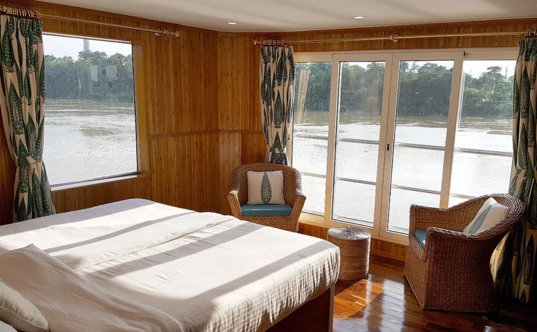 In an effort to conserve India’s forests, the interiors are bamboo-paneled, air-conditioned and roomy with en suite bathrooms. There is a spa and a saloon with a library. The dining room is on the main deck and a spacious sundeck at the very top. Fabrics on board have been handwoven by Bodo tribal villagers; the comfortable rattan chairs are locally sourced and made; and our gift shop stocks only arts and crafts made by local artisans.