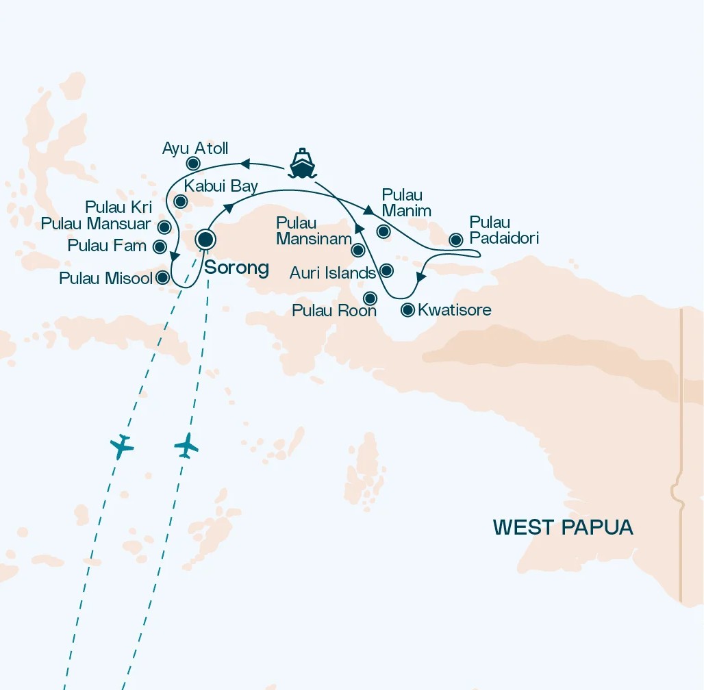 Sorong, located in West Papua, serves as a key transportation and logistical hub in eastern Indonesia. Set along the coast and surrounded by tropical landscapes, the city reflects the dynamic character of this remote region, shaped by maritime activity and regional connections. As the final point of the voyage, Sorong provides a practical gateway for onward travel, marking the conclusion of the expedition and guests’ return journey home.