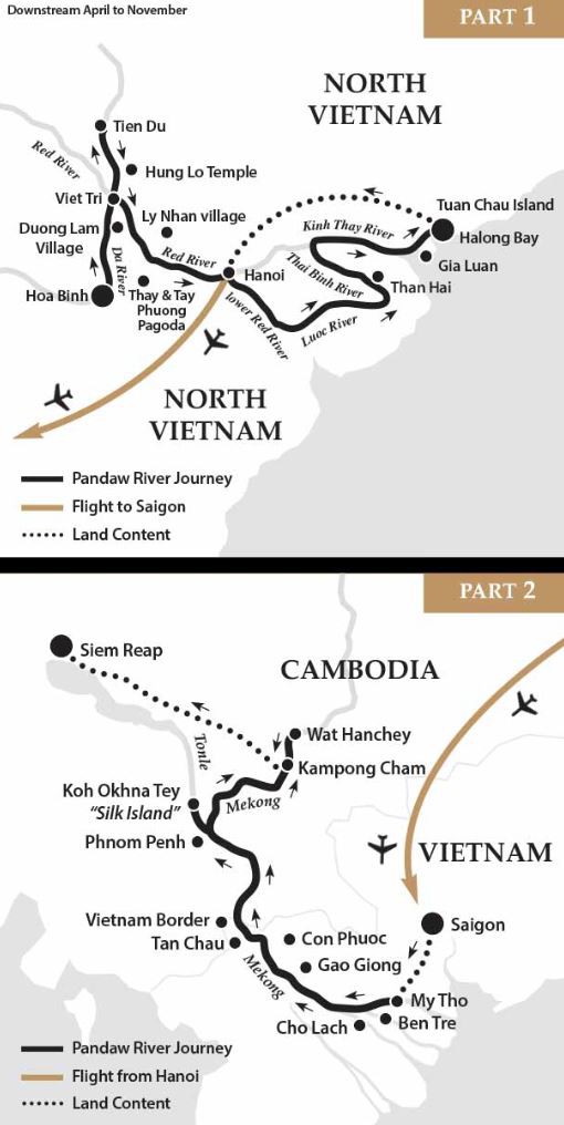 Combine the fascinating and varied Mekong River, with its striking cultural contrast between the bustling Vietnam delta and the tranquility of Cambodia, with exploring the key sites of Northern Vietnam by traversing the Red River delta and its main tributaries, connecting the wonders of Halong Bay with the excitements of downtown Hanoi, and then on into the interior, well off the beaten track. In between cruises spend a day at leisure to explore Hanoi or Siem Reap.