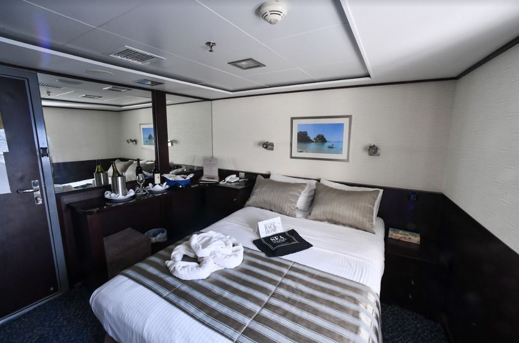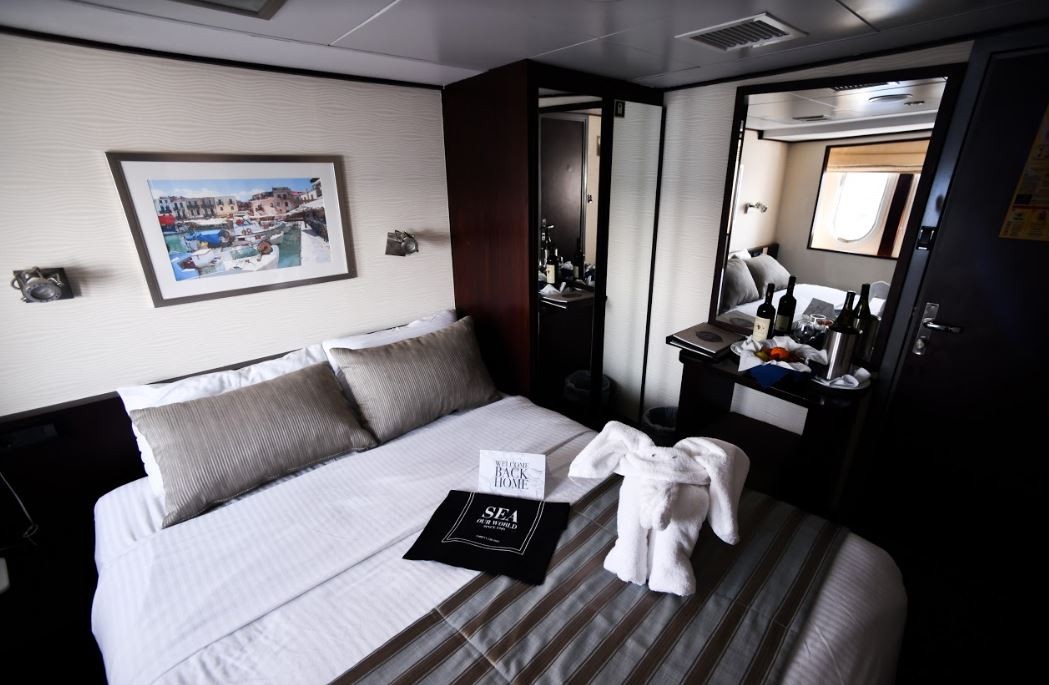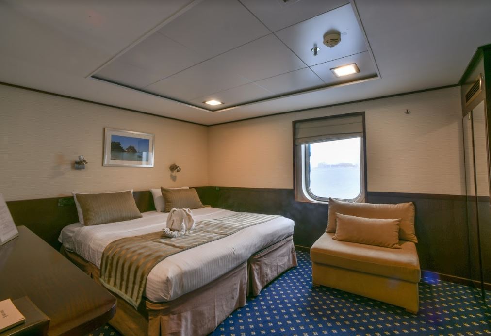Cabins are arranged across Lower, Main, and Upper Decks, all equipped with en-suite bathrooms, individually controlled air-conditioning, flat-screen TVs, mini-fridges, safes, hairdryers, internal telephones, piped music, and CD/DVD players. Lower Deck cabins offer portholes; Main and Upper Deck cabins have windows. Category P on the Upper Deck provides the most elevated setting. The ship’s internal layout keeps movement simple, with clear access between lounge, dining, outdoor areas, and cabins, producing a stable, predictable environment for a compact, yacht-style circuit through Greece.