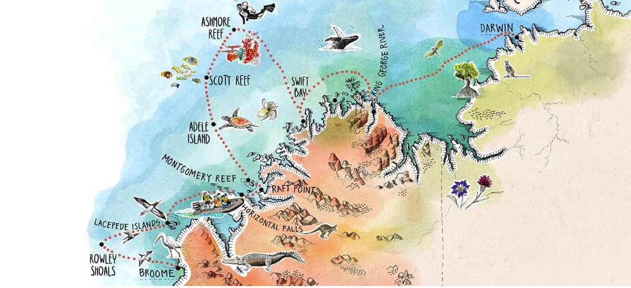 This new itinerary combines our classic 10-day Kimberley itinerary with a visit to the spectacular Rowley Shoals Marine Park and Ashmore Reef. Witness magnificent coastal vistas created by towering rock ridges, silent secluded gorges, abundant wildlife, and massive tidal movements. Expert guides interpret 40,000-year-old rock art, and retrace the history of Phillip Parker King who first charted this spectacular coastline 200 years ago. Board a Zodiac and touch the spray from the magnificent King George River and its towering 80-metre sandstone escarpments. Join an expert guide to learn about the history of the ancient Wandjina and Gwion Gwion rock paintings. Witness waterfalls cascading off Montgomery Reef as it rises out of the ocean on the ebbing tide, whilst discovering the reef’s diverse marine life. Finish off the voyage at a chain of coral atolls offering some of the best snorkelling and diving opportunities in the world. Their shallow lagoons are inhabited by myriad coral species and marine life, including giant potato cod, Maori wrasse, at least 233 species of coral and 688 species of fish – many of which are not found on other coral reefs.