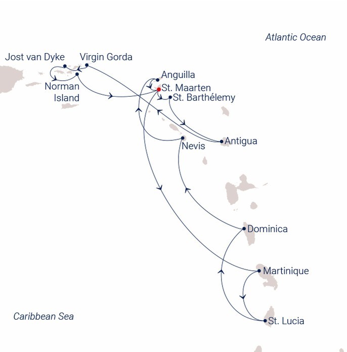 This sailing itinerary explores the northern and eastern Caribbean through a varied sequence of island cultures, natural landscapes, and open-water passages. Beginning and ending in St. Maarten, the journey blends lively ports such as Gustavia and Saint-Pierre with quieter anchorages in the British Virgin Islands, Dominica, and Nevis. Days under full sail are interspersed with time ashore to experience sheltered bays, volcanic coastlines, rainforest-covered peaks, and relaxed island harbours, creating a balanced voyage that moves fluidly between refined ports, unspoilt nature, and classic Caribbean seascapes.