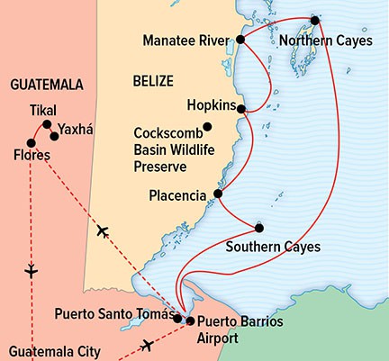 Board the 50-cabin National Geographic Quest and embark on a unique land-and-sea expedition to explore some of the 65 species of stony coral and 500 species of fish on the Belize Barrier Reef. Snorkel, kayak or paddleboard on colorful reefs over turquoise lagoons. Then, venture to the ancient Mayan ruins of Tikal. See temples overgrown with tropical rain forest and explore the stories and archaeological sites of these stone ruins swathed in rain forest teeming with wildlife.