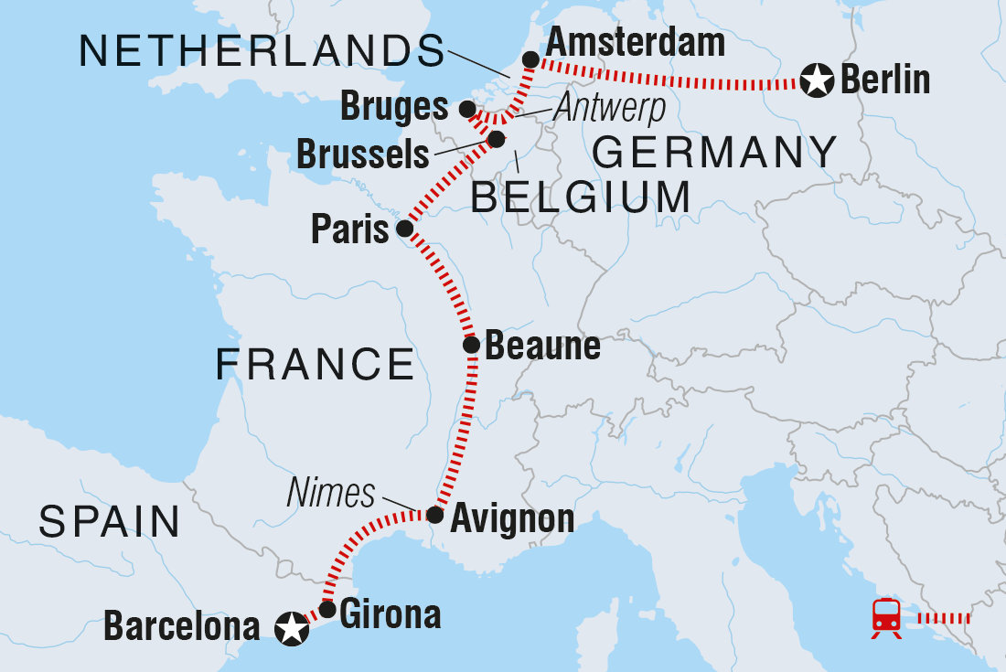 See Europe’s best cities on a 15-day adventure from Barcelona to Berlin. Full of fun, flexibility and loads of free time to explore each destination at your own pace, this adventure is perfect for independent travellers. Your passionate European leader will take you on regular orientation walks and give you plenty of insider knowledge, but how you spend your days is largely up to you. Wander the streets of Barcelona and see Gaudi’s architecture before exploring the medieval walls of Girona. Learn the history of gladiators in the Roman amphitheatre of Nimes and soak up the gorgeous scenery in Avignon. Visit some of the finest winemaking parts of France, then maybe picnic in Paris, have a beer in Brussels and explore a fairytale castle in Antwerp. Perhaps cycle the Amsterdam canals and see why Berlin’s nightlife is so iconic before ending it all with a toast to a whirlwind trip well-travelled.