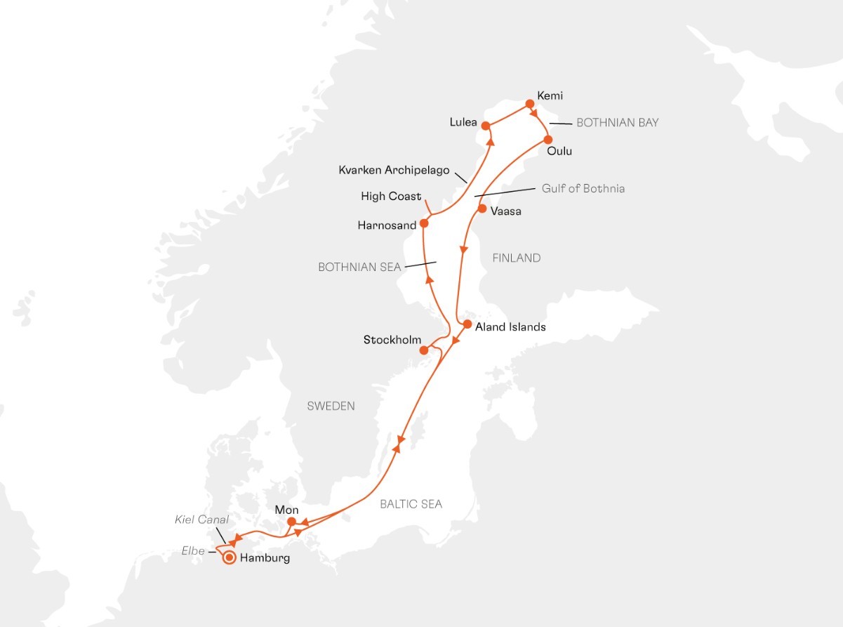 Gulf of Bothnia (Bothnian Sea and Bothnian Bay):expedition day in the High Coast Harnosand, arrival 22.00 hrsThe spirit of adventure will hang in the clear air as you press on into the northern extension of the Baltic Sea. Experiences that are only possible with a small expedition ship like Hapag-Lloyd Cruises ships await you on the flexible expedition day in the Bothnian Sea and Bothnian Bay. The deck tour at the bow, the glass balconies and the many open deck areas will become your front-row seats. Nature will provide you with constantly changing views. Your sightings will be enhanced by the interesting information provided by your experts on board.Set a course for Sweden’s special magic on an expedition day in the High Coast. The High Coast is a UNESCO World Heritage Site with diverse scenery, which you can enjoy from the many open deck areas on board. A harmonious watercolour of dramatic coastlines, dense forests and unique rock formations. This area has had the highest land uplift in the world since the end of the Ice Age. When cruising and with the Zodiacs, you will be able to discover this geologically interesting region in a flexible way, while your experts tell you some interesting facts about how it was formed and how it has changed over time. A perfect destination for nature lovers and inquisitive minds.