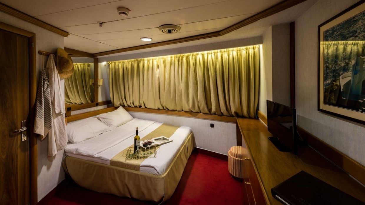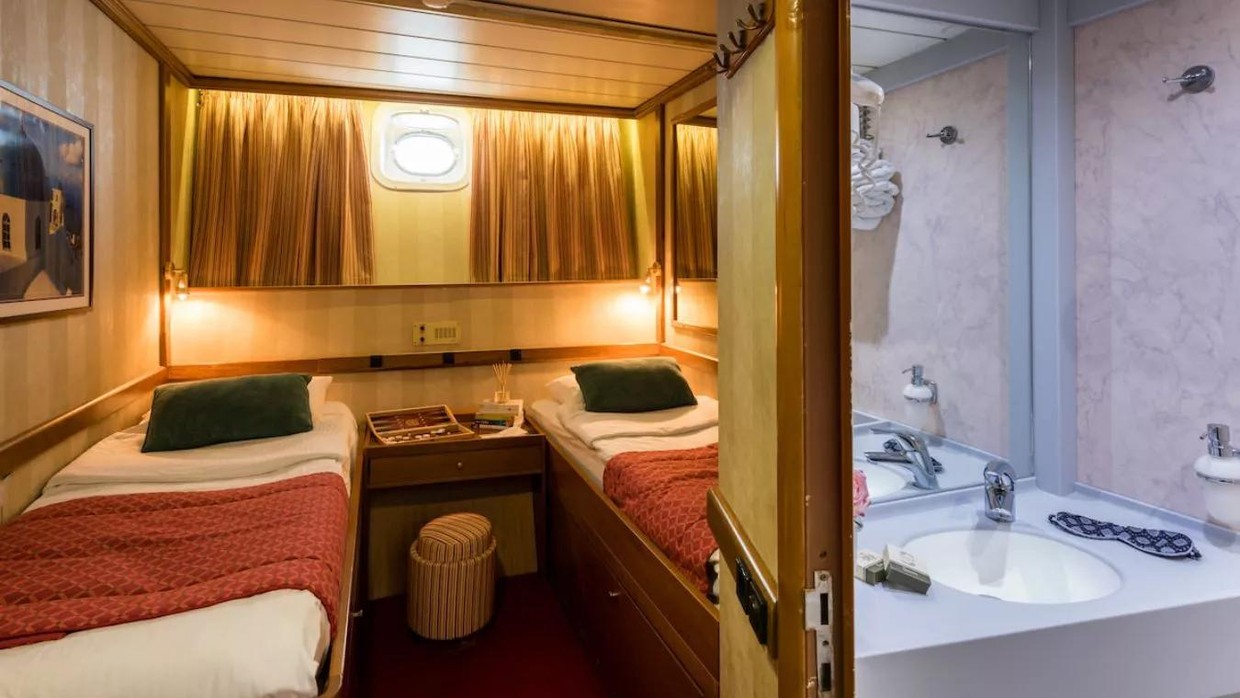 Vessel Type: Luxury Yacht Length: 53 metres Passenger Capacity: 49 Built / refurbished: 1993 / 2009 Panorama is a 54-metre, three-masted motor sailer built to SOLAS standards, carrying 49 guests at an unhurried 11-knot pace through the Greek islands. Her profile is defined by classic lines, varnished wood interiors, and wide deck areas split across multiple levels. Public spaces include a single-seating dining room with panoramic windows, a wood-panelled lounge with library, an outdoor bar, and two open decks for sunbathing and shaded retreat. A swimming platform, snorkelling gear, kayaks, and beach towels support water-based stops, while the vessel’s sail plan adds a traditional character seldom found in small-ship cruising. A crew of 16–18 manages service and navigation, keeping operations steady and unobtrusive. The ship offers 24 ocean-view cabins across three categories. Lower Deck cabins in Categories B and C use portholes and provide en-suite bathrooms finished in marble or Corian, along with TV, telephone, hairdryer, mini-fridge, safe, central music, and individual air-conditioning. Category A cabins are positioned on the Main and Upper Decks, replacing portholes with large windows and adding more natural light and outward visibility. Movement between decks is simple, with direct access from lounges to outdoor seating and the Sun Deck above. The scale, layout, and sail-assisted cruising style create a contained, traditional environment suited to slow exploration of the Aegean.