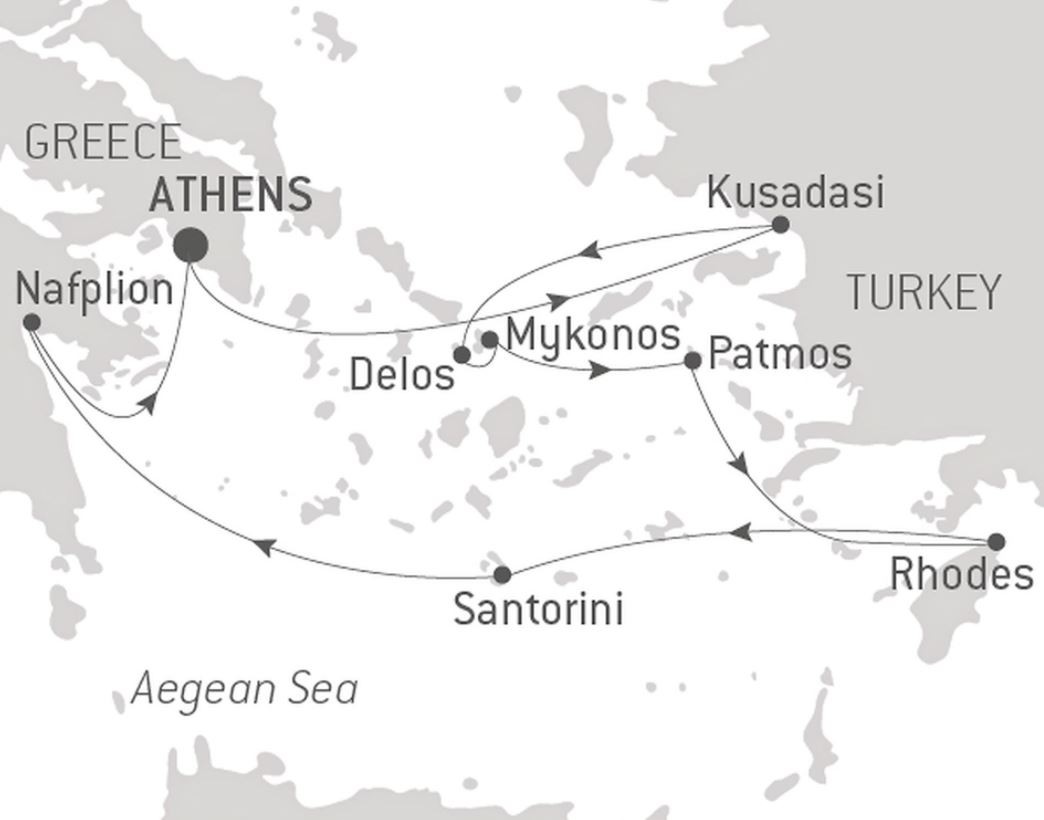 The unique Santorini, one of the pearls of the Cyclades awaits you, unfurling the grandiose circle of its caldera. Afterwards, you will set sail to Nafplio, the departure point for visiting the famous Epidaurus Theatre and the Mycenae site, listed as a World Heritage Site by UNESCO before calling at the island of Hydra, famous for its incomparable light before calling at the last step of your cruise: Athens, the mythical city dominated by the Acropolis and its monuments that form the most extraordinary architectural and artistic collection bequeathed by Ancient Greece to the rest of the world.