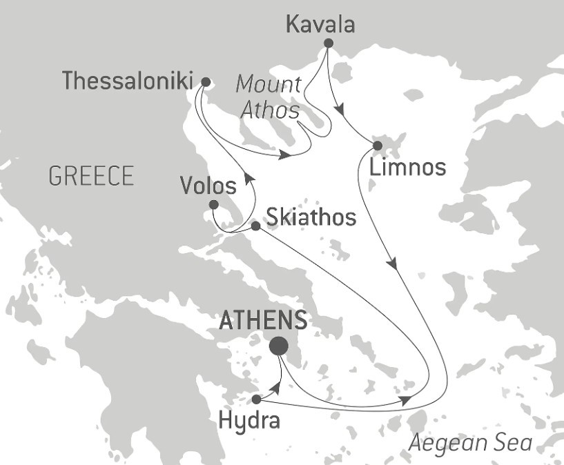 • Picturesque sailing along Mount Athos, a UNESCO World Heritage site, and a visit to the remarkable Thessaloniki.