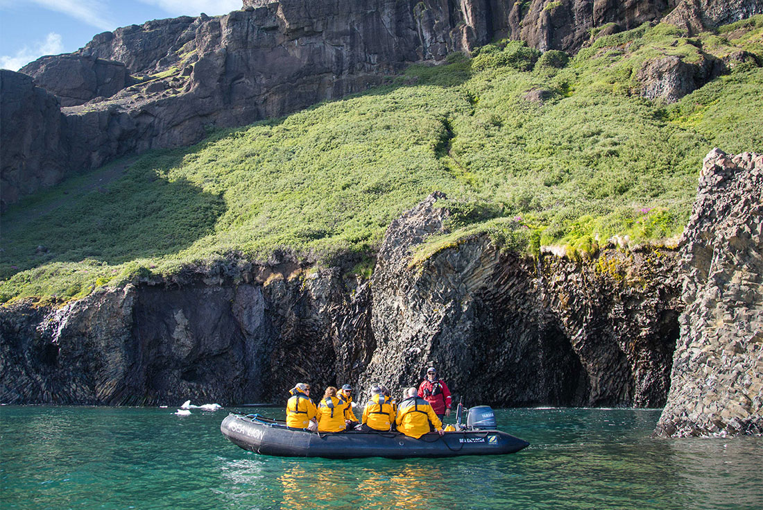 Over the next couple of days, you’ll sail Disko Bay – a wide, southeastern inlet of Baffin Bay and the largest open bay in western Greenland. Try to get out on deck as you navigate this iconic bay, where whales are often spotted in the deep sea. Disko Bay is full of exciting destinations to explore, including the community of Illulissat, at the head of the outlet fjord for Sermeq Kujalleq (Jakobshavn Glacier). Declared a UNESCO World Heritage Site in 2004, the fjord is a sight to behold, and there are many optional marked hiking trails to explore further. Discover the wild beauty of Equip Sermia or the Torsukatak Fjords, in the northeast corner of Disko Bay. Both of these remote areas offer fantastic vistas of large, active glacial faces, with plenty of opportunities for hiking, paddling and Zodiac cruising. This is where, if conditions allow, you might be treated to a ride in one of the twin-engine helicopters to appreciate the immensity of this region from above. You may also get the chance to visit one of the oldest settlements in Greenland, Qeqertarsuaq, settled by whalers in 1773 (but archaeological evidence suggests that people lived here at least 6000 years earlier). The town and surrounding area are the island’s only volcanic region. The area offers unusual geology and colourful landscapes, with particularly lush vegetation. More than half of Greenland’s plant species are found here, tucked between columns of basalt rock and black sand beaches littered with ice fragments. In town, you don’t want to miss Qeqertarsuaq’s Vorherres Bleaekhus, which hosts musical performances by resident artists. Local guides will also lead walking tours to the church, shopping area and the local museum. If time and weather permit, there’s the chance to hike to the incredible basalt columns 10 km down the coast.