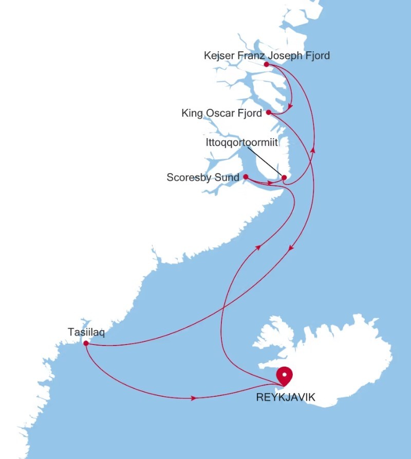 Enter fjord systems of staggering scale and beauty. From Iceland, sail into Greenland’s frozen wilderness and the vast network of Scoresby Sund — where fjords branch in every direction and icebergs the size of cathedrals drift by silently. Watch for polar bears near Ittoqqortoormiit, and journey north to remote Kejser Franz Joseph Fjord. Navigate the massive Kong Oscar Fjord — 16 miles wide in places — before experiencing Inuit culture and returning to Reykjavik.