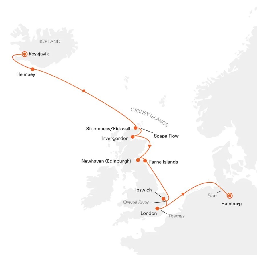 Orkney Islands/Scotland/Great Britain (Stromness, cruising through Scapa Flow, Kirkwall)Discover charming Stromness, the “grey town by the sea”, which owes its name to its characteristic scenic houses. In the listed centre, inviting piers, imposing warehouses and trading houses combine history and maritime flair perfectly. An absolute highlight is the impressive former Viking settlement, which allows you to immerse yourself in the fascinating history of this region. But the Orkneys also mean wind, water and walking: enjoy spectacular views on nature trails. The experts at your side will take you on a journey of discovery to important testimonies of the past – from a Neolithic stone circle to a Stone Age village and a 17th-century manor house.Cruising through Scapa Flow, a large harbour bay in the south of the Scottish Orkney Islands, combines the North Sea world with history. Around you is nothing but a wide expanse of water lined with gentle coastal strips. And below you are the remains of the dramatic scuttling of the German High Seas Fleet in 1919: during the negotiations for the Treaty of Versailles, the German Rear Admiral Ludwig von Reuter feared that the ships could fall into the hands of the Allies. To prevent this, he ordered the sinking of his own entire fleet in order to preserve the honour of the German Navy. Today, Scapa Flow is a popular diving destination known for its wrecks.Untamed charm envelops the Orkney Islands. The archipelago, consisting of around 70 islands, forms a spectacular backdrop for your insights into European cultural history. Kirkwall on the mainland, with its red and yellow sandstone St Magnus Cathedral built in 1137, is an imposing reminder of the Middle Ages – one of the most interesting buildings in northern Scotland. Narrow, cobbled streets are lined with traditional shops and pubs. Enjoy the opportunity to go for an independent stroll. Kirkwall is also an ideal starting point for exploring the surrounding area, with its prehistoric sites, rugged coastline and gently rolling hills.