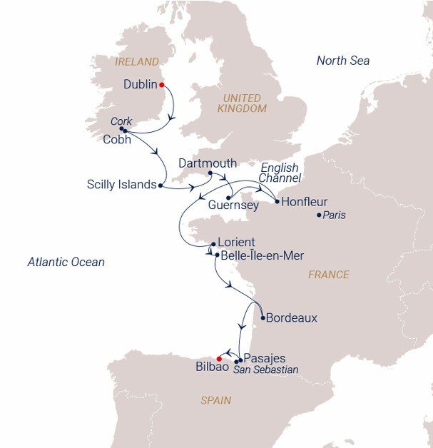 This voyage traces a varied Atlantic route from Ireland to northern Spain, weaving together historic ports, island communities, and renowned cultural centres. Departing Dublin, the journey follows Ireland’s south coast before crossing to the Scilly Isles and the characterful harbours of southern England. French highlights include the artistic quays of Honfleur, the island landscapes of Brittany, and an extended stay along the Garonne in Bordeaux, where maritime history meets wine culture. The route then continues south to the Basque Country, concluding in Bilbao after visits to San Sebastián’s celebrated coastline and culinary scene.