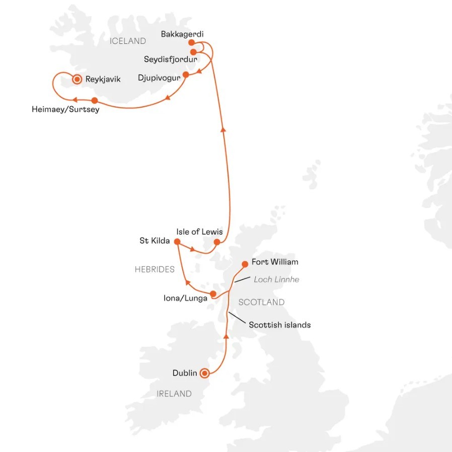 Sailing from Dublin to Reykjavík, this expedition voyage explores the dramatic island landscapes of the North Atlantic. The journey navigates the rugged coastlines and sea lochs of western Scotland to reach Fort William beneath the slopes of Ben Nevis before venturing into the wild archipelagos of the Inner Hebrides and Outer Hebrides, where remote islands shelter seabird colonies and traces of ancient cultures. Continuing across the open sea, the voyage reaches eastern Iceland, calling at fjordside settlements including Seyðisfjörður and Djúpivogur. The expedition concludes among the volcanic landscapes of the Westman Islands before arrival in Reykjavík, combining remote island wildlife, Norse and Celtic history, and some of the most striking coastal scenery in northern Europe.
