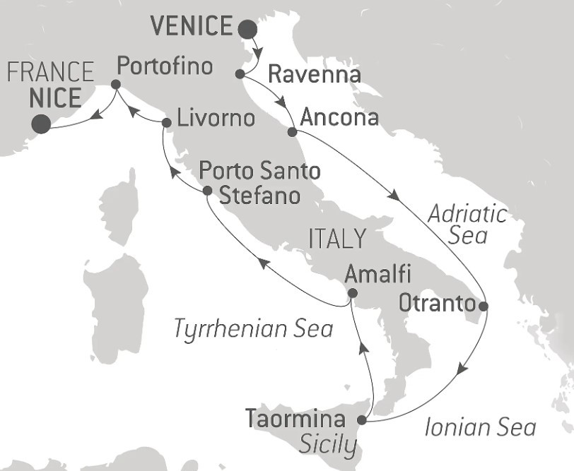 From Venice, La Serenissima, you will sail to Ravenna. Capital of the Roman Empire in the 5th century, the city bears witness to a thousand-year-old history where Roman and Byzantine cultures mingled and which can be seen today inside the city’s religious buildings through its ancient mosaics.