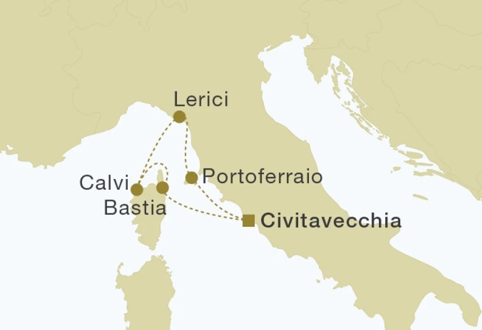 Roundtrip from Civitavecchia, this voyage links the historic shores of Italy with the rugged beauty of Corsica. In Bastia, narrow streets and a lively harbour reflect the island’s maritime character, followed by Calvi, crowned by its hilltop citadel and framed by mountainous landscapes. Returning to Italy, Lerici recalls the legacy of Romantic poets along the Gulf of Poets, while Portoferraio reveals Napoleonic history and traces of ancient Etruscan civilisation before the journey concludes back in Civitavecchia.