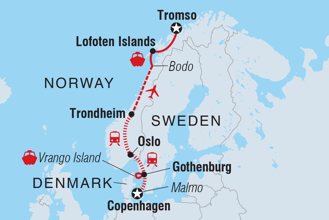 From beautiful cities that seamlessly blend historic architecture and modern design to sprawling landscapes of pristine natural beauty, Scandinavia has a lot going for it. This 15-day journey through Sweden, Denmark and Norway begins in stylish Copenhagen, where the streets are made for cycling. Discover the neoclassical architecture and delicious hagabullen (cinnamon buns) of Gothenburg before escaping to the serene beaches and nature reserves of the Gothenburg archipelago. Have your curiosity piqued at Oslo’s eccentric museums and discover endless photo opportunities in Trondheim, one of Norway’s prettiest towns. Explore the majestic mountains, deep fjords and untamed beauty of Norway’s north while exploring around the Lofoten Islands. Wrap up the adventure above the Arctic Circle in Tromso, under the midnight sun.