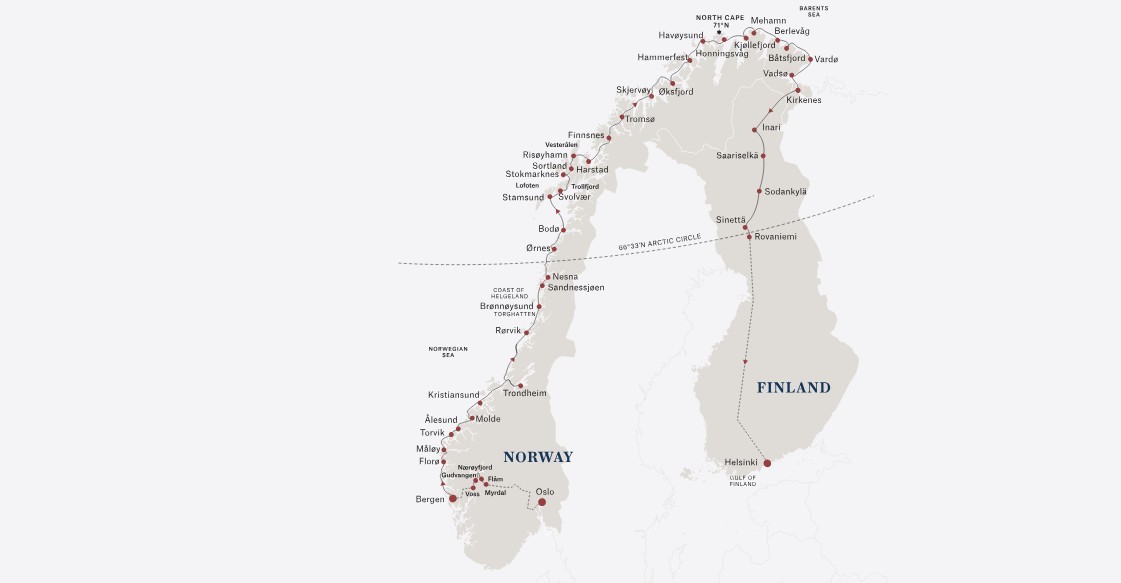 Ride the Flåm Railway to Bergen discovering inland Norway before joining our iconic Coastal Express voyage to Kirkenes. Search for the Northern Lights as you travel by train across Finland’s Arctic interior, sleeping in a glass igloo and visiting the Santa Claus Village before visiting Helsinki.