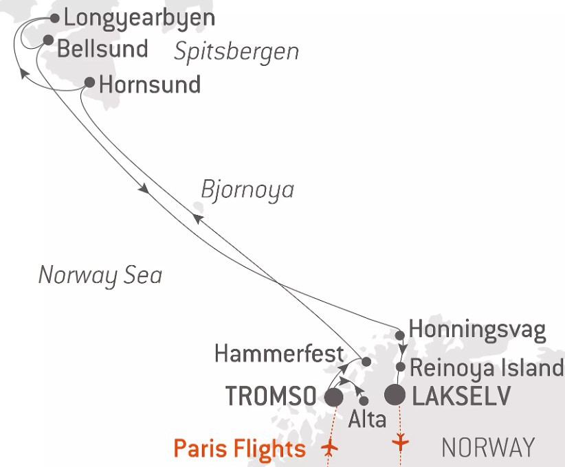 You will set sail towards the shores of continental Norway at the edge of the Arctic Ocean: welcome to Lapland! Very close to the emblematic North Cape, the northernmost point of Europe, sovereign nature delivers geological marvels in the heart of a fjord – a preserved island, dolomites and rocky rises formed during the last glaciation. The Sami, reindeer farmers and one of the last European indigenous people, live between rugged shores and snow-capped peaks, remarkable coastal cities and large wild expanses, in the Lapland territory. During warm encounters, you will discover their cultural traditions and their way of life, in harmony with the elements. Immerse yourself in nature and, while the night overtakes the day, set off to chase the Northern Lights.