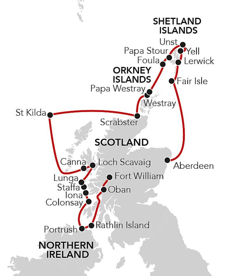 With our fleet of Zodiacs we are able to visit some of the most r emote islands that surround the Scottish Coast including Canna, St Kilda, Foula and the northernmost point of the United Kingdom at Unst and land on remote beaches and cruise close to shorelines and cliffs dotted with birdlife. Few cruise ships offer the chance to explore in-depth the islands off the northern coast of Scotland and this unique cruise ventures far north to the Hebrides, Orkney and Shetland Islands. We will witness vibrant colours and wonderful birdlife, explore deserted villages and learn of the history and ancient culture of unique island life.