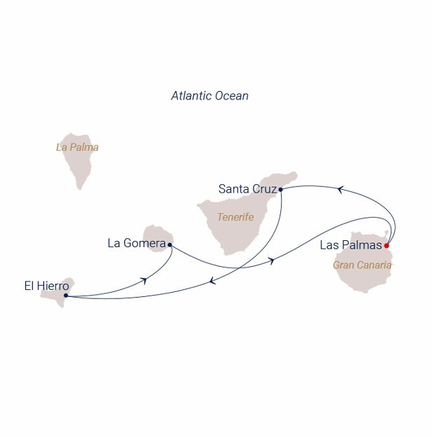 This short Canary Islands circuit combines concentrated sailing with intense natural variety. From Gran Canaria, the route touches Tenerife’s dramatic volcanic landscapes shaped by Mount Teide, then continues to El Hierro, a remote island defined by raw geology, quiet villages, and nature-first living. La Gomera adds deep green contrasts with its cloud-fed laurel forests and rich marine life offshore, where whales and dolphins are frequently sighted. The voyage returns to Gran Canaria having traced a compact arc through some of the archipelago’s most unspoiled and geologically expressive islands.