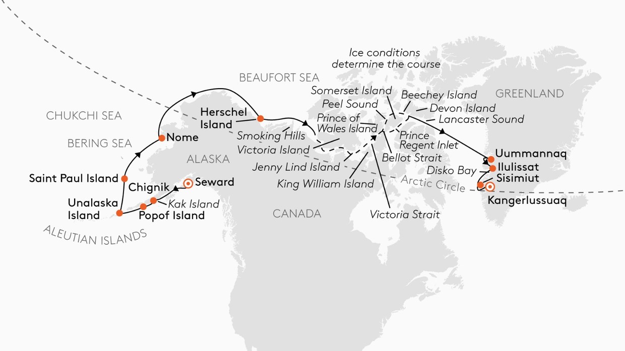 Embark on an extraordinary cruise that traces a legendary waterway, blending awe-inspiring solitude with daring exploration along a route mastered by only a few ships. This journey, shaped by weather and ice, offers an active Arctic adventure with Zodiac excursions and hikes, promising sightings of polar bears, musk oxen, Arctic foxes, and whales in their natural realm. Starting in Seward, Alaska, the voyage navigates the rugged Alaska Peninsula and Aleutian Islands, ventures through the Bering and Chukchi Seas, and braves the iconic Northwest Passage from the Beaufort Sea to Lancaster Sound, featuring remote stops like Herschel Island, Victoria Strait, and Beechey Island. The expedition concludes along Greenland’s stunning west coast, with visits to Uummannaq, Ilulissat, and Disko Bay, before ending in Kangerlussuaq—a trip where the route itself, rich in natural wonders and Arctic mystique, becomes the ultimate destination.