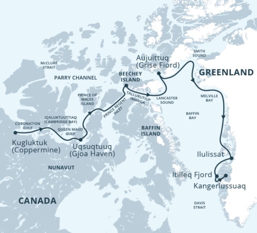 Traverse the Northwest Passage from the central Canadian Arctic to western Greenland. Route moves through Inuit homelands, narrow straits, and high-Arctic channels where wildlife concentrates. Historic sites of the Franklin expedition sit alongside modern communities, while Greenland’s coast delivers glaciers, icebergs, and broad fjords. This is a transitional voyage shifting from low, island-studded Arctic landscapes to Greenland’s mountainous icebound coast.