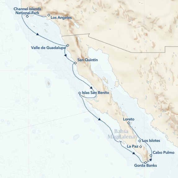 Migrate alongside humpback whales and numerous seabird species on a unique early-winter journey from Los Angeles to Loreto. Explore the Channel Islands’ intact wildness, thriving with endemic species. Sail to Ensenada and discover Mexico’s Wine Country—the Valle de Guadalupe. Spot a variety of species among the 25,000 birds migrating along the Pacific Flyway. Continue down the pristine coastline of Baja California, home to a panoply of sea life, untamed desert wilderness, and otherworldly sunsets.