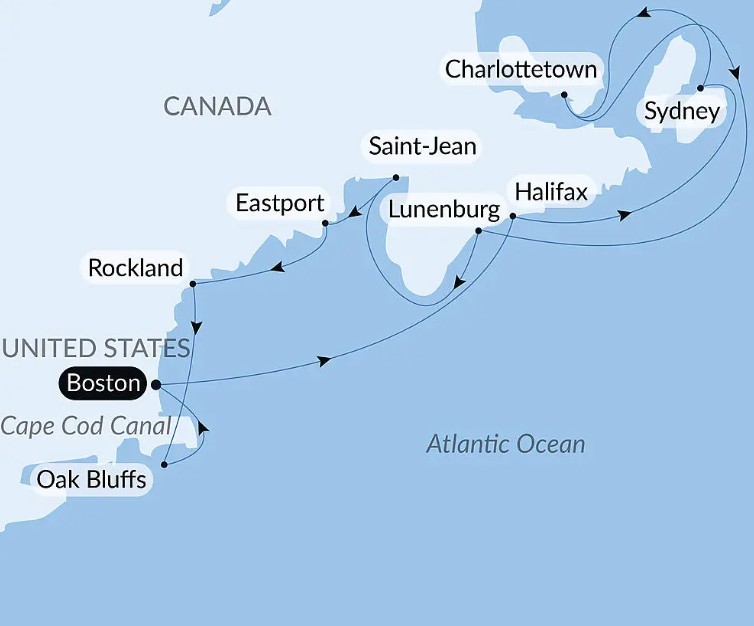 Explore the emblematic shores of the North Atlantic, from New England to Canada’s Maritime Provinces. From Boston and Cape Cod to the historic and picturesque ports of Nova Scotia, New Brunswick and Prince Edward Island, this itinerary follows a coastline shaped by wind, tides and centuries of history. Sail between fishing villages with enduring charm, ocean-lashed cliffs and enchanting bays opening onto the Atlantic. Combining colonial heritage, maritime traditions and landscapes tinged with autumn hues, this cruise offers an elegant and authentic immersion in the heart of the North Atlantic.