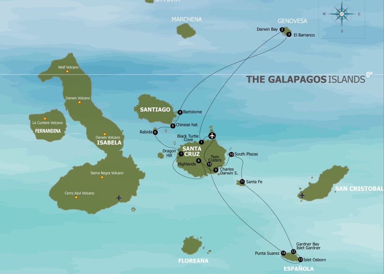 Embark on an enchanting exploration of the eastern Galapagos Islands, starting with Baltra and Santa Cruz. Dive into the serene waters of Turtle Cove and witness the conservation efforts at Darwin Station. Venture into the lush Highlands, encounter diverse species at Dragon Hill, and marvel at the unique geological formations of Los Gemelos. Plazas Island awaits with its remarkable wildlife and landscapes. On Genovesa Island, explore Darwin Bay and El Barranco, surrounded by diverse birdlife. Santiago Island beckons with the iconic landscapes of Bartolome and Sombrero Chino, while Rabida Island captivates with its vibrant red shores. The journey concludes at Española Island, where the dramatic Pta. Suarez and the pristine Gardner Bay offer a grand finale to an unforgettable Galapagos odyssey.