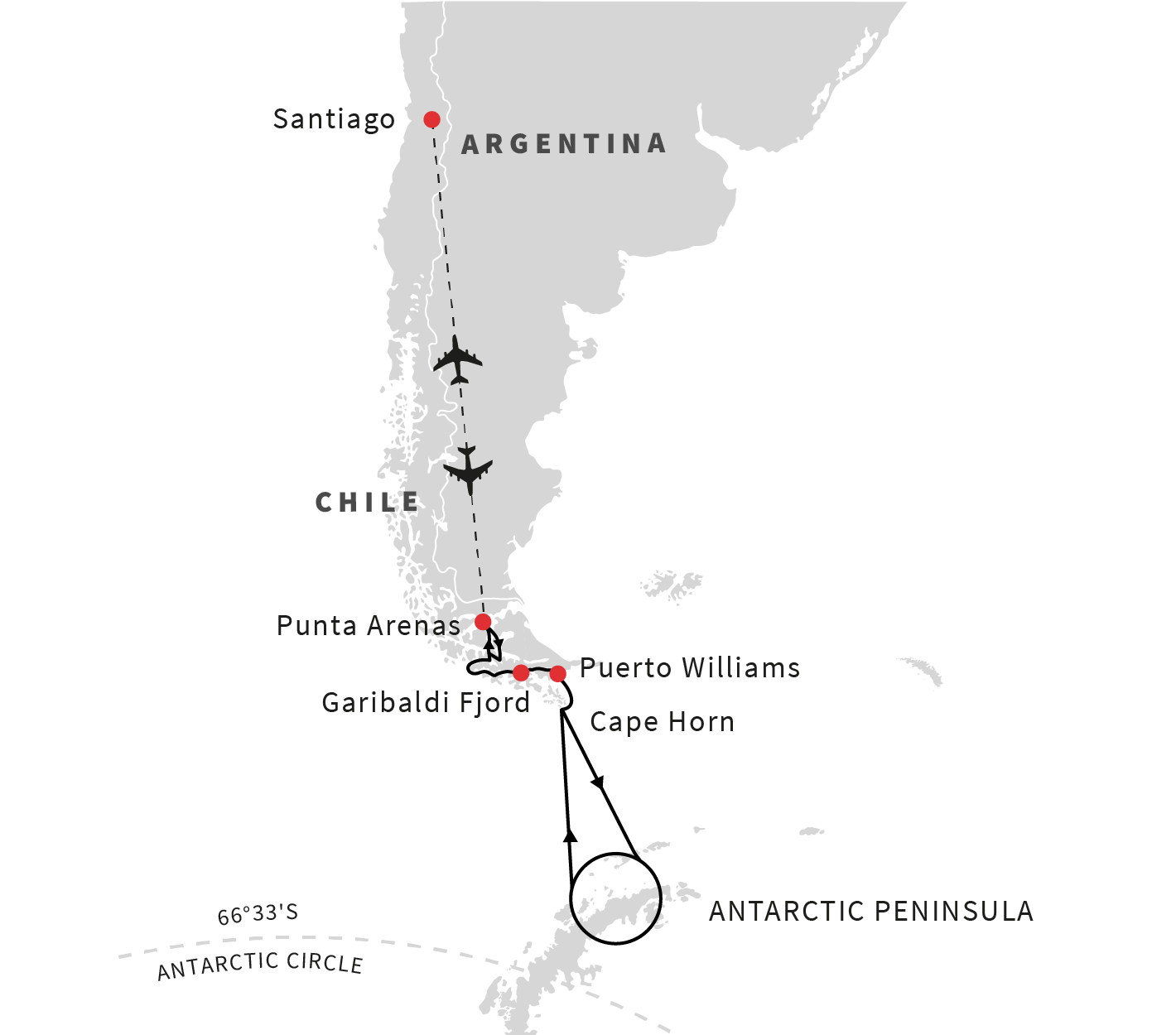 Please Note: your voyage rates include return economy flights between Punta Arenas and Santiago de Chile