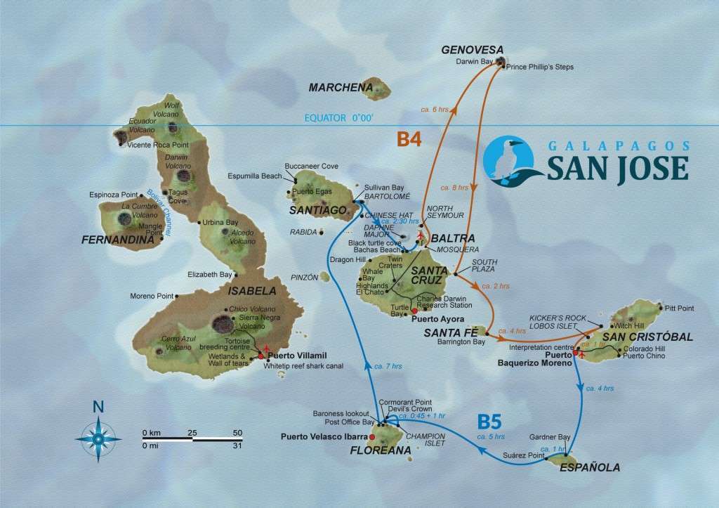Moreover this route combines three of the most spectacular snorkel sites of Galapagos: Kicker Rock (Leon Dormido), Champion Islet and Bartolome, where you might encounter fishing Galapagos penguins. Besides that this route also offers plenty possibilities for optional scuba diving.
