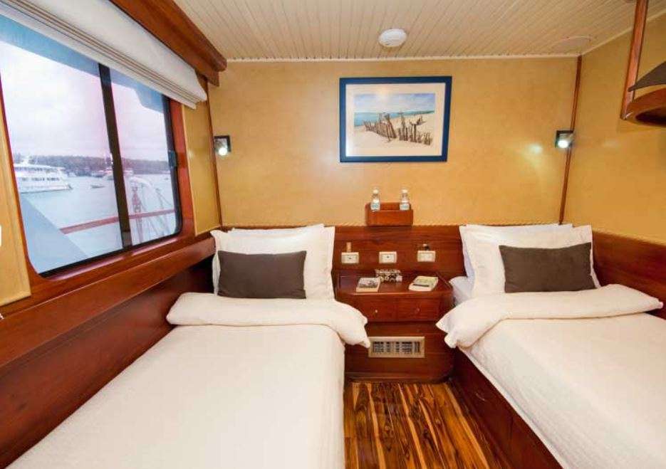 This 88-foot motorized, 20-passenger yacht offers high-polished wood trim and floors, a library with TV and DVD player, and sun deck with chaise lounges. The spacious dining area allows you to comfortably eat while marveling at the stunning views of the Galapagos archipelago.