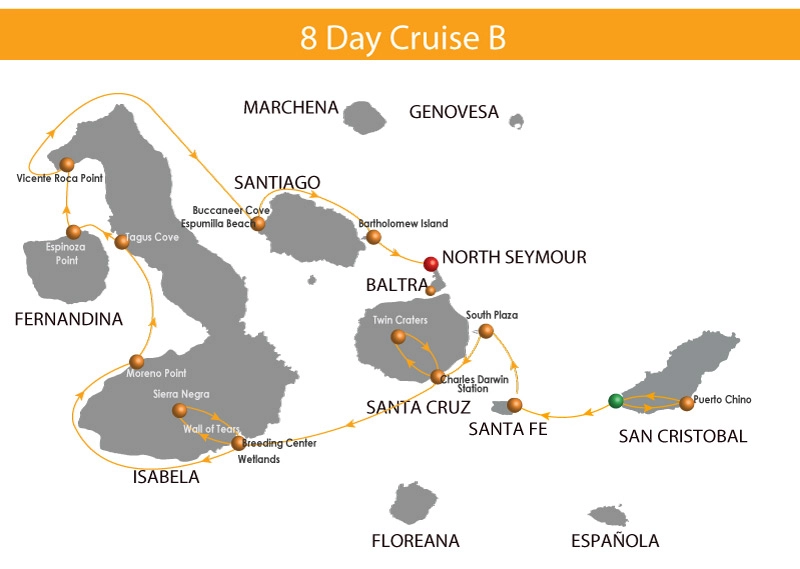 The eleven double cabins spread over the ship’s three decks have air conditioning and private bathrooms with hot water. The Galaven has two different eight-day itineraries, as well as four- and five-day excursions. Two bilingual national park naturalist guides will show you the wonders of the Galapagos. Also accompanying you on the cruise are the captain and eight crew members.