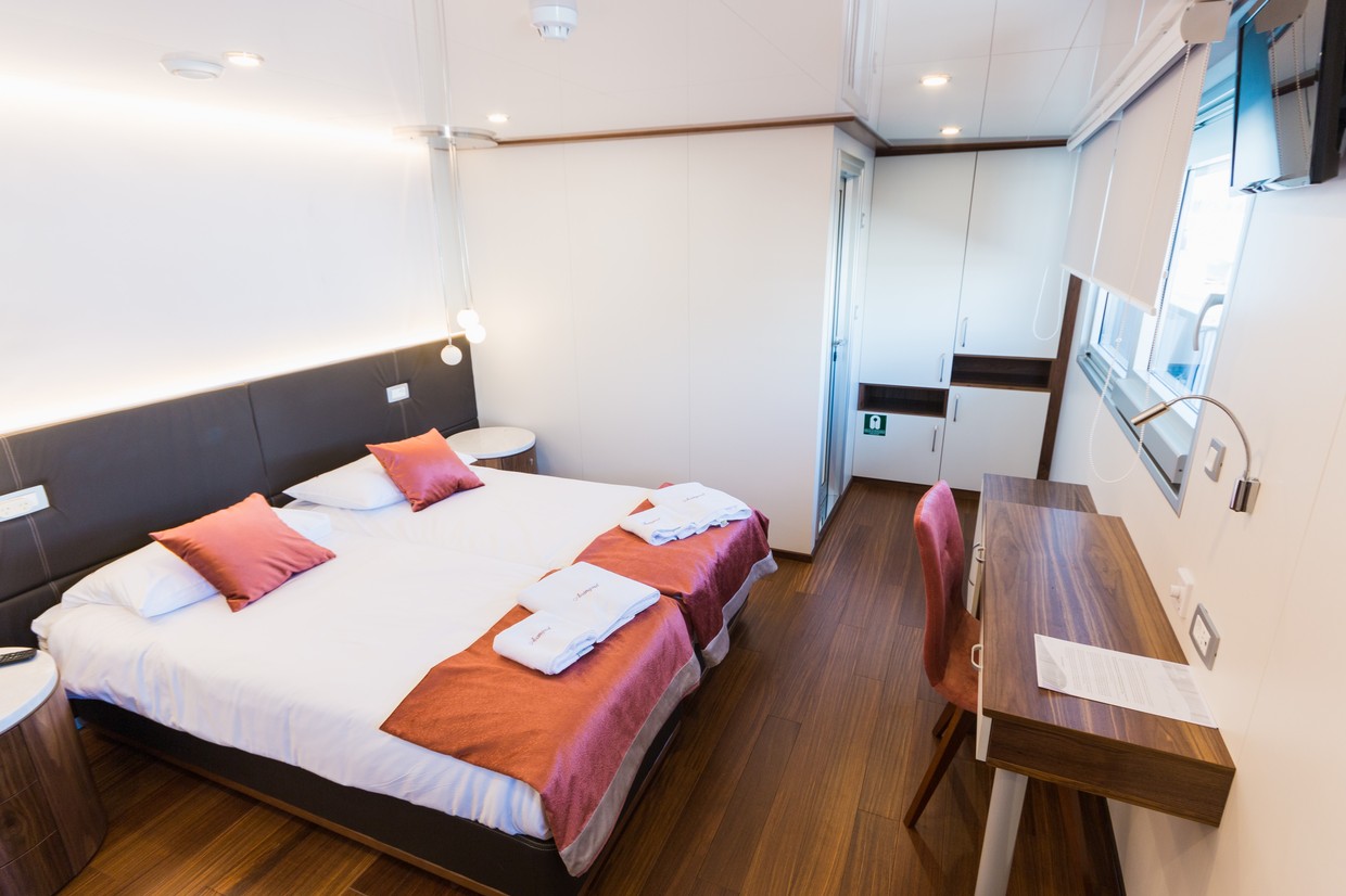 The MV Aquamarin is a luxurious and modern vessel designed for cruising along Croatia's stunning coastline. It features contemporary amenities and state-of-the-art equipment, ensuring a comfortable and memorable journey for its guests. With a passenger capacity of 38, the ship boasts 19 well-appointed cabins, including a variety of double and twin options across three decks, all equipped with air conditioning, flat-screen TVs, safes, and other modern comforts.