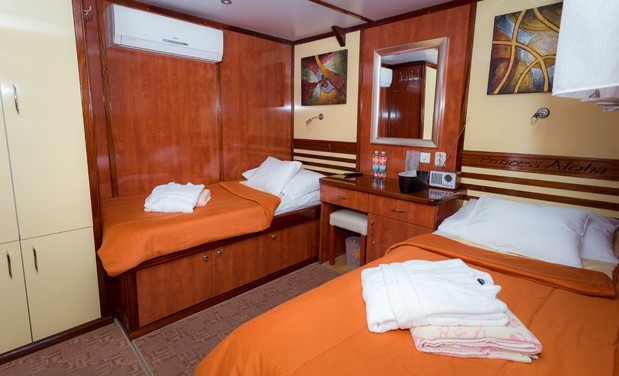 M/S Princess Aloha is a premium small ship built in 2013, designed to deliver comfort, privacy, and efficient coastal cruising. She accommodates up to 36 guests in 18 cabins, including twin, double, and triple options. All cabins are fully air-conditioned and soundproofed, featuring en-suite bathrooms, LCD TV, safe deposit box, fire alarm, internal communication system, hair dryer, and fireproof doors to ensure safety and privacy throughout the voyage.