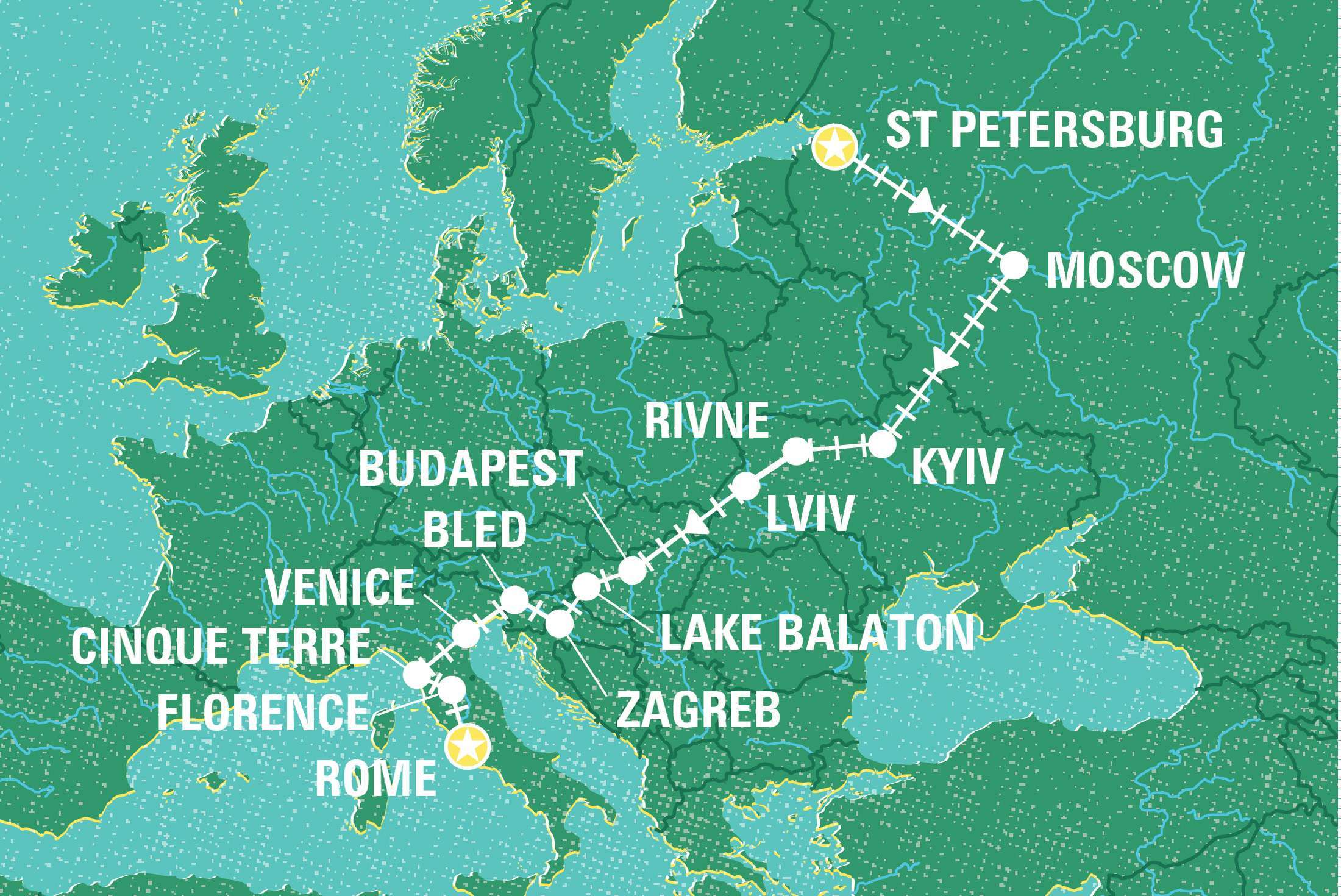 Ride the rails from Russia to Italy through Eastern Europe’s most charming cities and get a taste of the good life. Break the ice with a Russian face? a loft pub tour in St Petersburg will do! Feel the cool vibe in Kiev? let’s check out the funky street art! Ever heard of Tunnel of Love? check! Soaking up the good vibes and minerals in Budapest’s stately thermal spas? Yep. Cruising across Lake Balaton’s emerald waters? Consider it done. But don’t forget Zagreb’s awesome museums and nightlife, or the piece de resistance – a big fat slice of cream cake straight out of Bled. Yet the romantic Italy also waits ahead! Drinking a sunset spritz in Italy’s famous sinking city, embrace some crazy views at the Cinque Terre, and immerse yourself in the great art and architecture in Florence and Rome! Pick up your boarding pass and join us on this rollicking rail journey through Russia, Eastern Europe and Italy.
