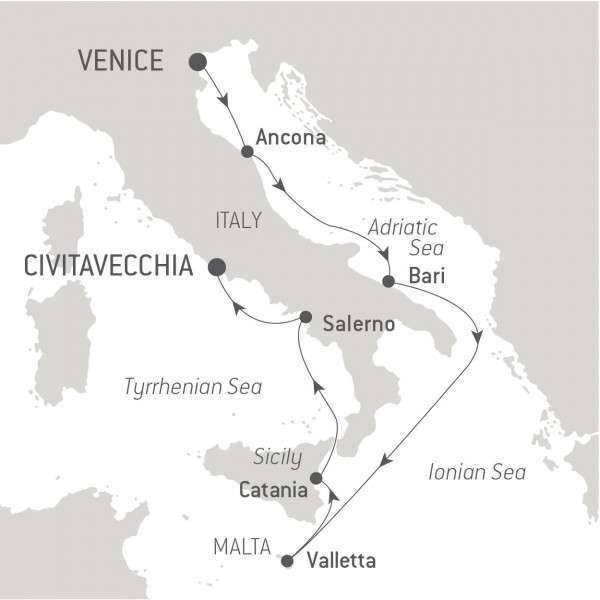 From Venice, the Serenissima, you will call at different Italian sites including Bari, a town located in the magnificent Puglia region.