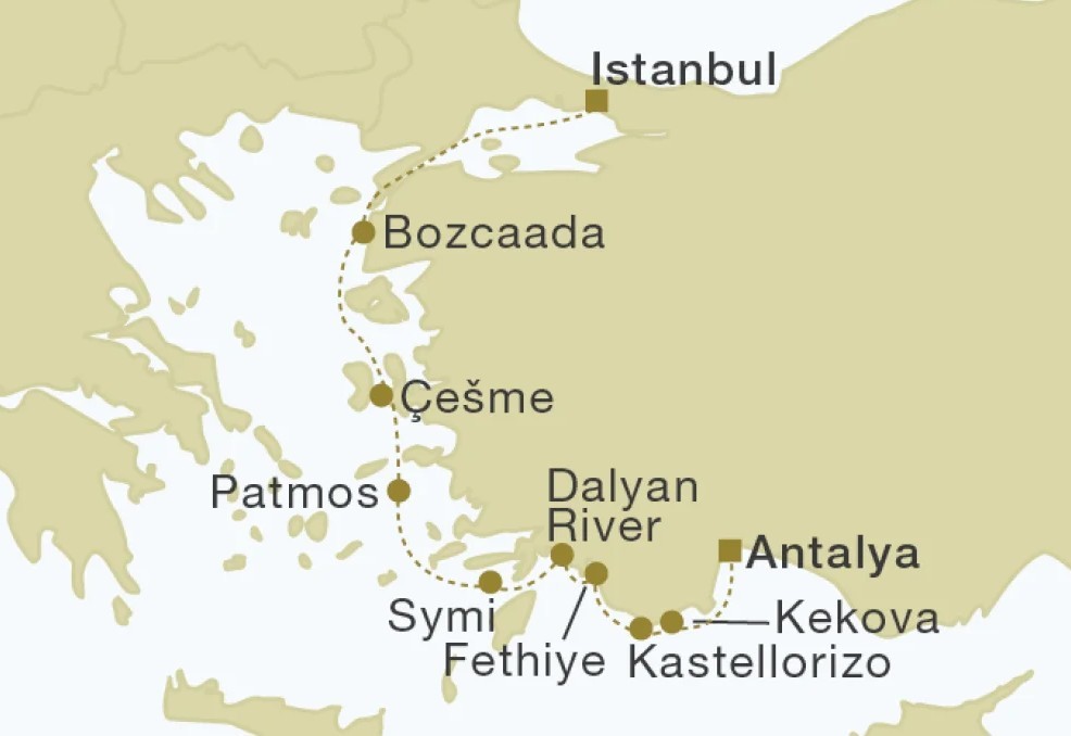 Beginning in Antalya beneath the Taurus Mountains and concluding in Istanbul, this voyage traces the Lycian and Aegean coasts through a sequence of archaeological sites and island harbours. Sail to Kekova to view the submerged Lycian ruins and continue to Kastellorizo, Greece’s easternmost island. Along Türkiye’s Turquoise Coast, explore Fethiye and the wetlands of the Dalyan River near ancient Caunos. The itinerary then crosses to Symi and Patmos, before returning to Türkiye at Çeşme and Bozcaada, pairing neoclassical harbours and monastic heritage with vineyard landscapes and coastal scenery.