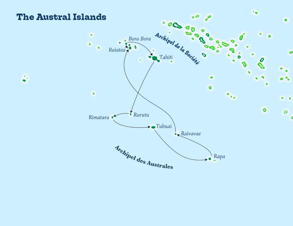• Discovered by Europeans in the 18th Century, the Austral islands are located 600 km south of Tahiti. Off the beaten track, the Australs are an untouched and mysterious land where white sand clashes with the intense blue of the lagoons.