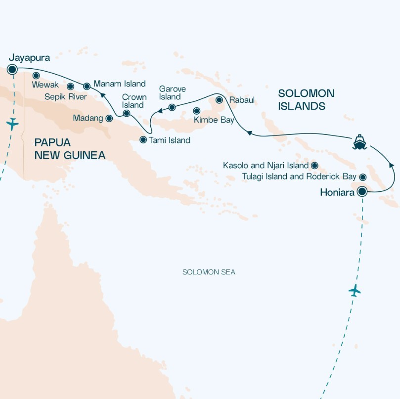 Departing from Honiara on Guadalcanal Island, your voyage explores the rich tapestry of islands and coasts across the Bismarck Sea – Pavuvu Island, Kasolo (Kennedy) Island, remote Njari Island, the volcanic ports of Rabaul, and the abundant marine habitats of Kimbe Bay. Sail onwards to Garove, Tami, and Crown Islands, then explore the scenic coasts of Madang and Manam. Journey along the storied Sepik River to Kopar Village, visit Wewak, and conclude in Jayapura, Papua.