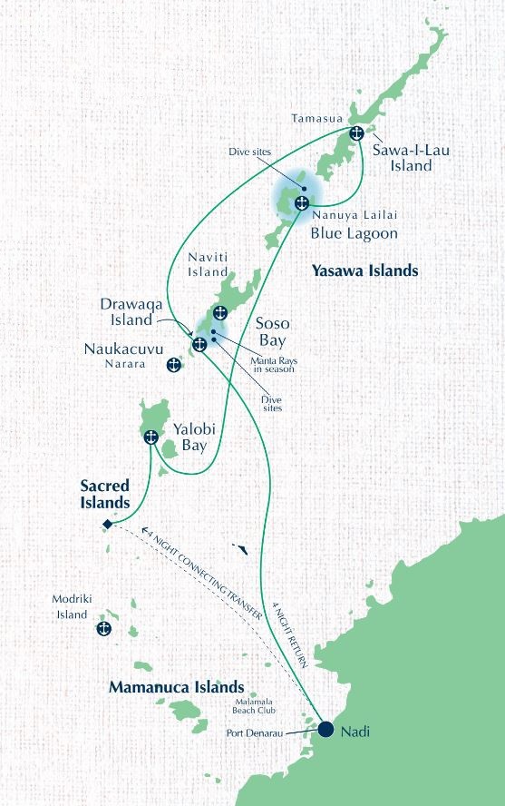 To ensure you have the best possible cruise experience, we use ‘flexible cruising’. What this means is that we’re prepared to alter our itineraries, either when necessary, or when some exciting opportunity arises. For example, if there is some special event taking part in a local Yasawa Village, which you really should see, then we will alter our cruise route to take you there. Or, if we think that that our destined anchorage for the night is not going to be as sheltered as a bay on the other side of the island, we’ll up-anchor and move. Cruising through a region of coral lagoons and isolated island anchorages is weather dependent and so, at times, our itineraries may need to be altered. However we’ll always endeavor to ensure all of the highlights of each cruise are enjoyed by our guests.