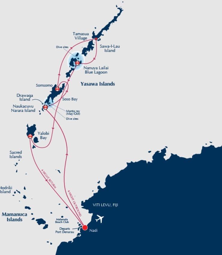 To ensure you have the best possible cruise experience, we use ‘flexible cruising’. What this means is that we’re prepared to alter our itineraries, for weather-related reasons or when an exciting opportunity arises. For example, if there is some special event taking place in a local Yasawa Village, which you really should see, then we will alter our cruise route to take you there. Or, if we think that our destined anchorage for the night is not going to be as sheltered as a bay on the other side of the island, we’ll up-anchor and move. However, we’ll always endeavour to ensure all the highlights of each cruise are enjoyed by our guests.